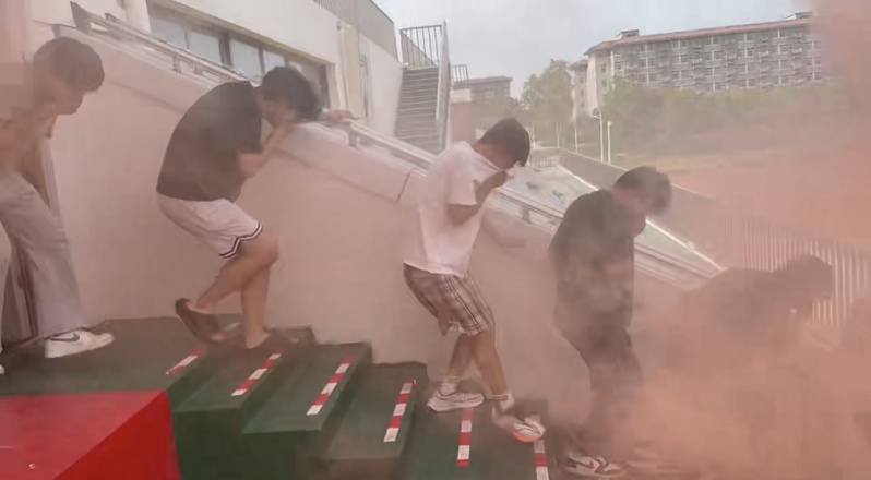 演练前,学院安全负责人在看台207教室开展消防安全培训,通过图文与案例,讲解火灾预防知识,并现场示范用湿毛巾掩口鼻、弯腰低姿前行等逃生技巧,手把手指导灭火器、消防栓使用,还用楼层平面图明确疏散路线与集合点,确保人人知晓行动要点。演练中,烟雾弥漫,大家迅速用衣物捂鼻,压低身形,弯腰沿规划路线撤离。走廊里,负责老师手持扩音器维持秩序、引导方向,同学们配合默契,有序前行。短短数分钟,全体人员安全撤离至操场,演练圆满结束。