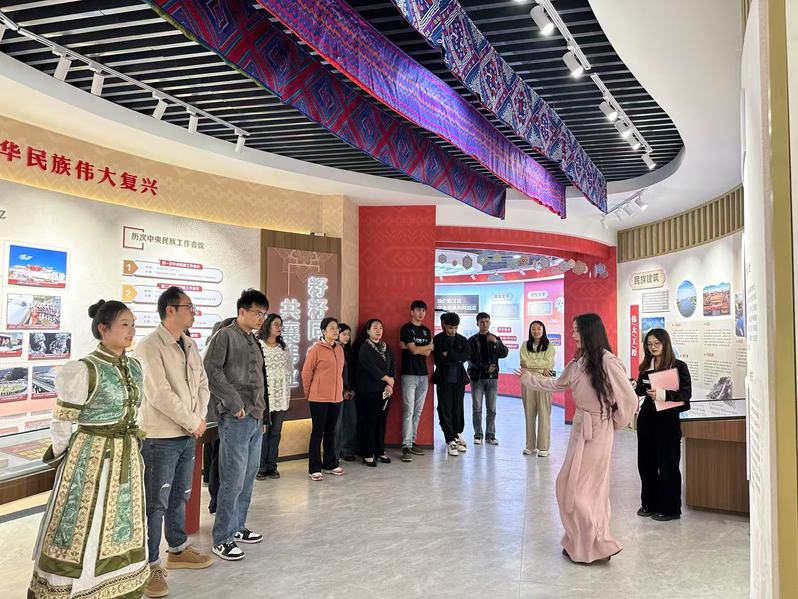 踏入体验馆,师生们仿佛穿越时空,在讲解员的引领下,深入探索各民族多元一体的历史脉络。从古老的民族服饰到传统手工艺品,从独具特色的风俗习惯到辉煌灿烂的文化成就,丰富的展品与生动的场景,全方位展现了各民族相互依存、和衷共济的紧密联系。参观过程中,少数民族学生积极分享本民族文化,蒙古族和藏族的同学表演了民族舞蹈,现场气氛热烈,文化的火花在此激情碰撞。